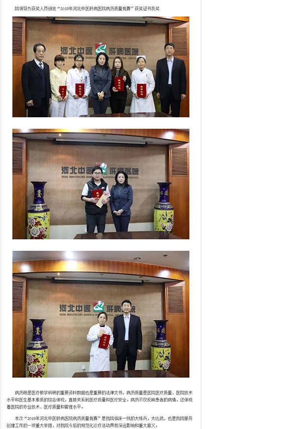 石家庄新闻网报道了河北中医肝病医院4月6日下午,在会议厅举行“2019年河北中医肝病医院病历质量竞赛”活动,次次活动是在河北中医肝病医院创建“服务型医院”的时代背景下,为进一步提高临床医务人员的法律意识、质量意识、风险意识和安全防范意识,全面提高病历质量,提高服务水平而实施的一项重要举措。